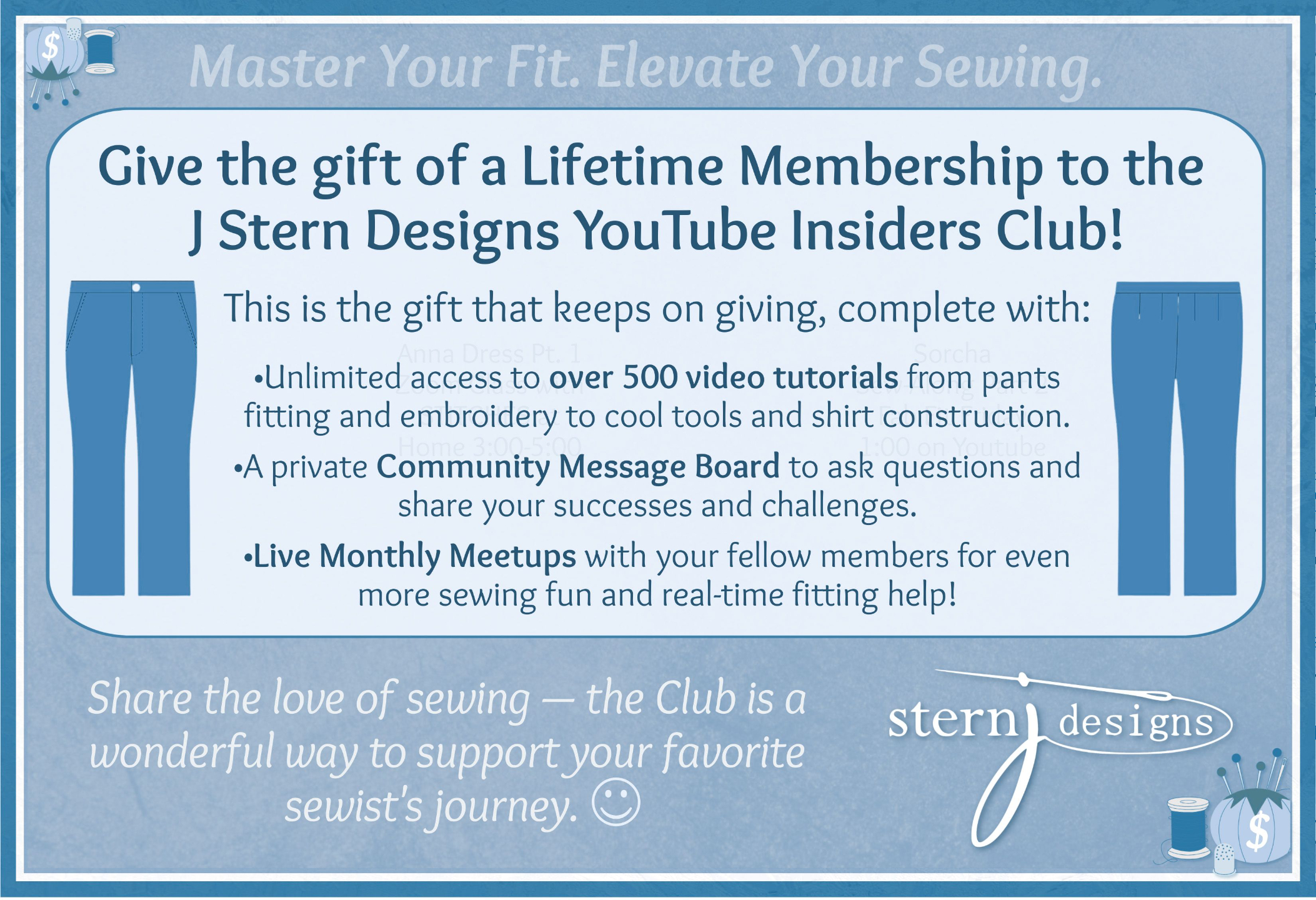 Treat the sewist in your life to a gift that keeps on giving! A gift membership to the J Stern Designs YouTube Insider Club offers exclusive access to in-depth tutorials, organized by topic, live Q&As, fitting tips, and a vibrant community of fellow makers. Whether they’re just starting out or refining their skills, this is the perfect way to inspire creativity and confidence—all year long